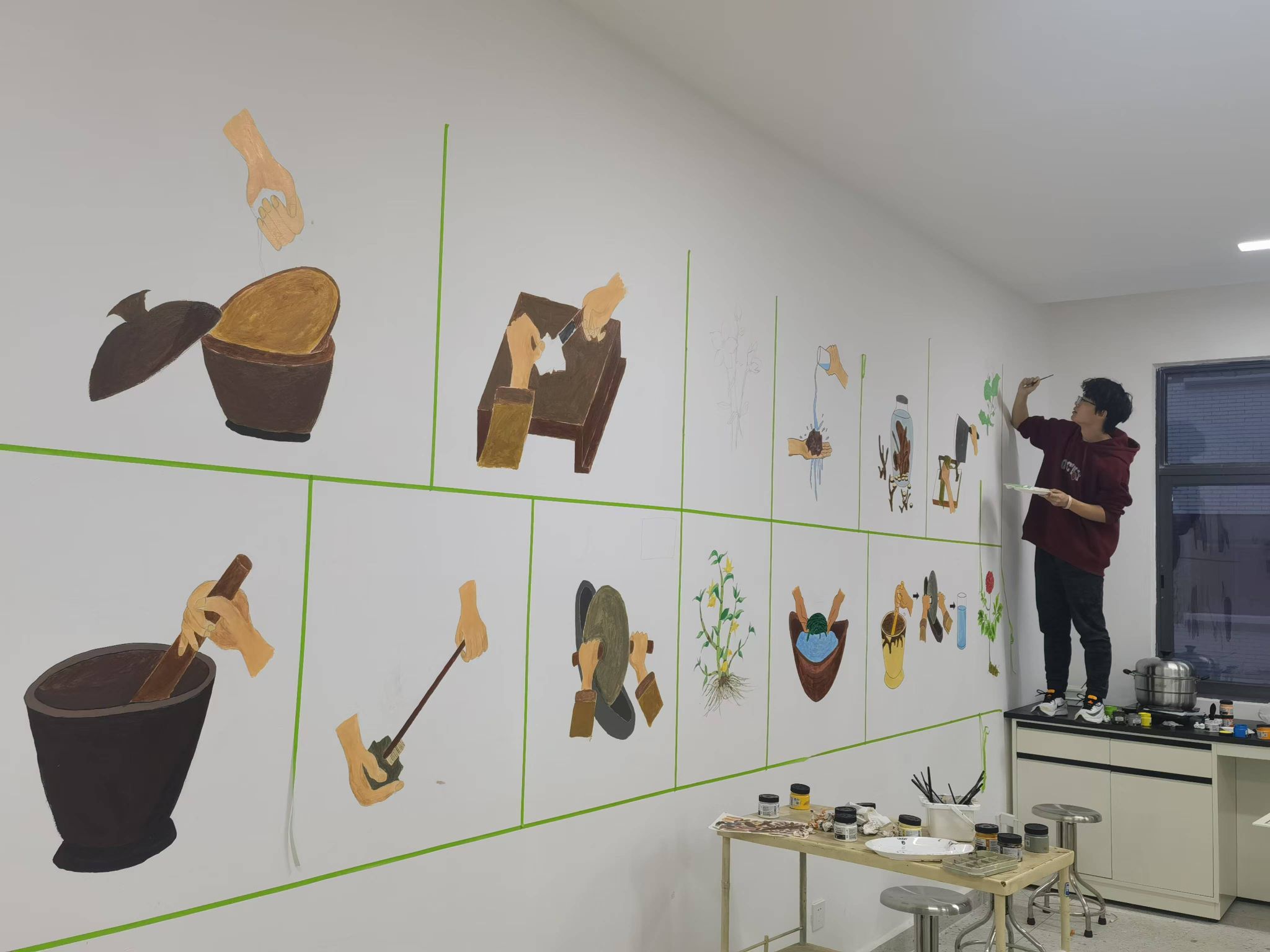 壁画绘画让中药炮制室焕然一新,生动展现了中药炮制的不同方法和各个环节——修制,筛选,剪切,粉碎,刷净,碾,水制(淋洗,润、泡,切片,润洗,水飞),火制(炒,煅,炙,烘焙),水火同制(蒸,煮,炖,淬,炮)。从净制、切制到炮制,每一个步骤都栩栩如生。这些壁画不仅是艺术的展现,更是对中药炮制这一传统技艺的生动诠释,使学生们在实践操作中能够更好地理解炮制工艺的精髓,体会其中蕴含的中医药智慧。