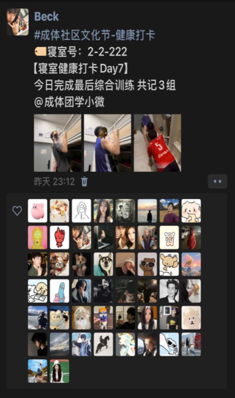 在连续7天的“健康打卡”寝室健身日记挑战活动中,各寝室需每日完成15分钟以上的集体锻炼,通过微信朋友圈发布#成体社区文化节-健康打卡#话题动态,附运动项目、时长及健身感悟,并@校级官方公众号进行打卡。活动中,各寝室积极参与,产出了40余种运动方式,充分展现了学校“以体育人”的办学特色。
