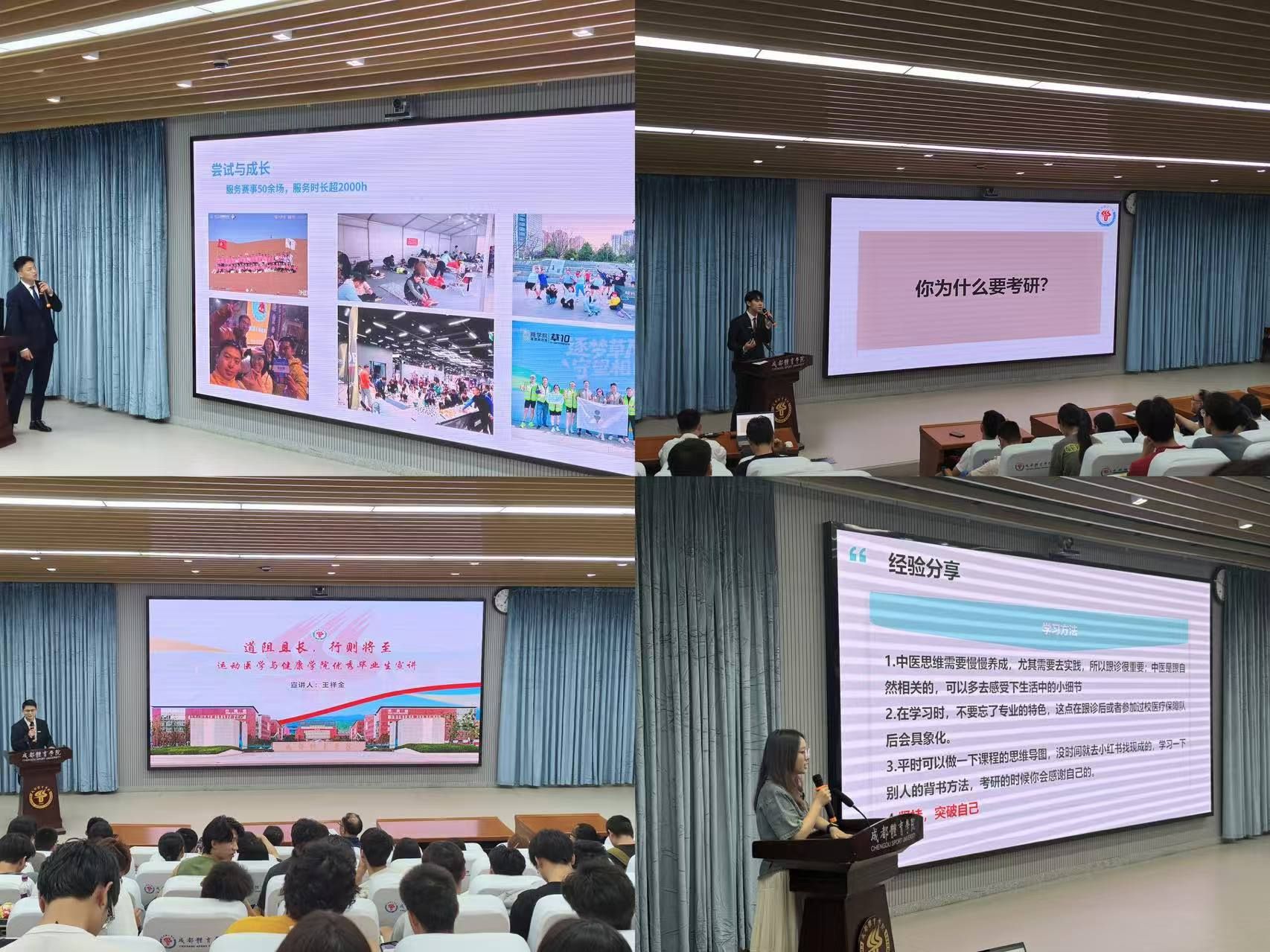 会上四位优秀毕业生结合自身经历传递成长智慧。曾王,现任成都筋膜颜匠健康管理公司联合创始人兼CEO,深耕赛事服务与创业实践;周婉妮,获国家奖学金、国家励志奖学金等,凭优异成绩推免本校研究生;陈纪儒,成绩名列前茅,拟录取本校运动医学专业;王祥金,专业成绩第二,获四川省优秀毕业生,发表7篇SCI(3 篇一作),拟录取成都中医药大学博士。