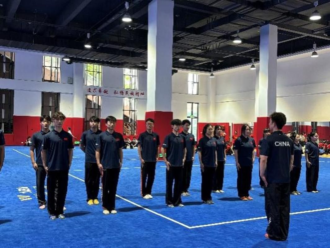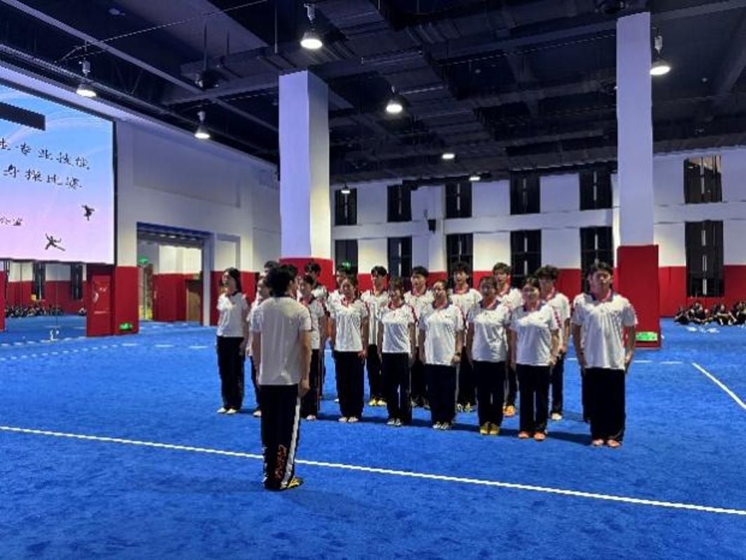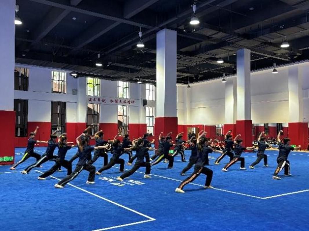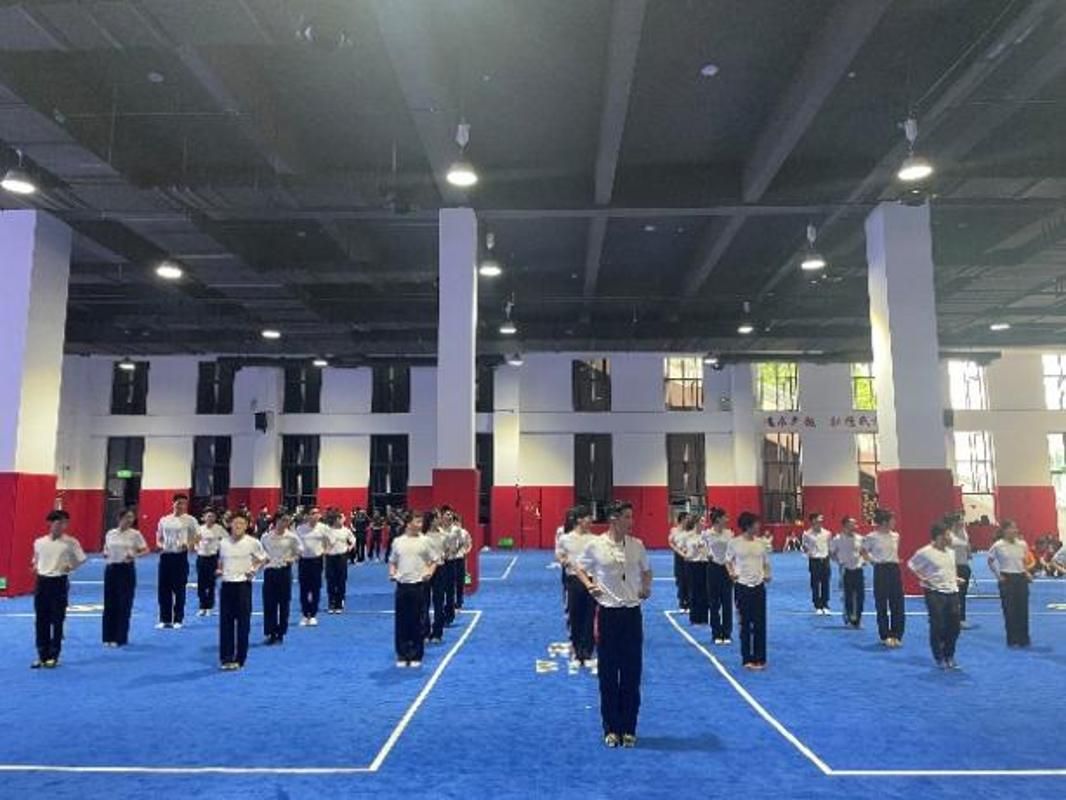 赛场上,运动员身着统一服装,动作舒展有力、功架扎实,口令从容,精神面貌优秀,彰显成体武术人积极进取的品质,展现专业技能实践与技术水平及 “厚德尚武,追求卓越” 院风。