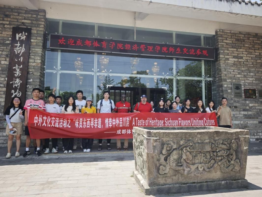 2025年6月15日,经济管理学院体育经济与管理(中外)专业师生赴成都市郫都区川菜博物馆参观,感受川菜文化,开展了一场别开生面的人文交流活动。辅导员潘同心,学业导师刘芸芸,南印第安纳大学授课外教Gerard 、Jason及学生代表参加活动。