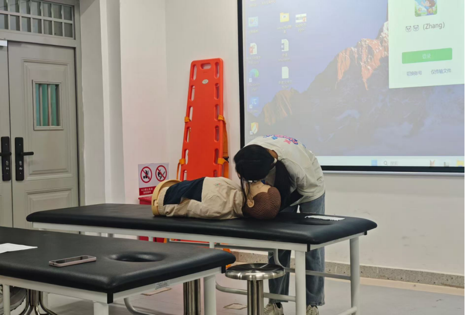 “运动处方制定”环节采用小组PPT汇报的形式,同学们需要针对不同人群制定个性化的运动处方,涵盖运动前的健康筛查以及具体的运动处方内容。“现场急救模拟”即现场急救心肺复苏演示,包括胸外按压操作和人工呼吸,同学们将所学的急救知识熟练运用到模拟场景中,动作迅速、操作规范、冷静应对,充分展现了良好的专业素养和应急处理能力。