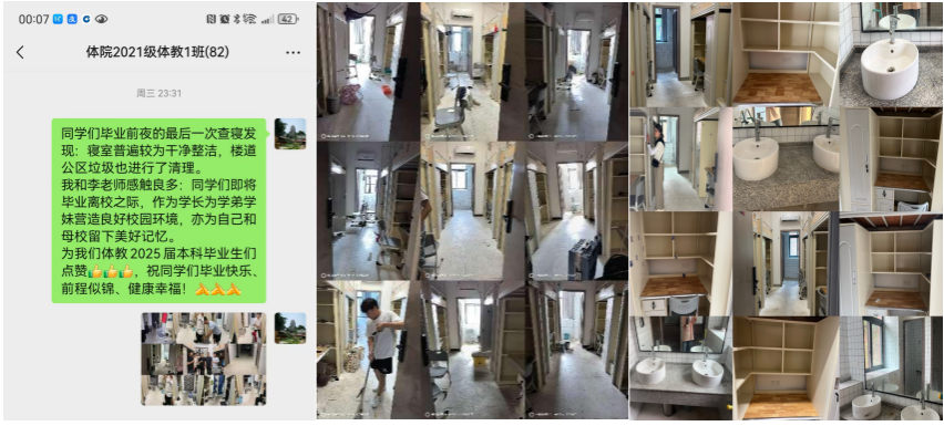 文明离寝,感恩相“寓”。一间间整洁干净的寝室,彰显对母校依依不舍之情。离校前,体教学子以宿舍为单位,齐心协力开展了大扫除:清空个人物品,让宿舍不再杂乱;清理废弃物品,还空间一片清爽;配合公物检查,确保设施完好……同学们留下的不仅是干净的环境,还是对母校深深的眷恋与感恩,更是为未来入住学弟学妹们送上的一份温暖。
