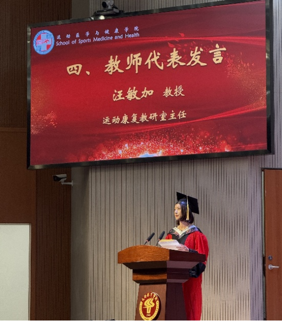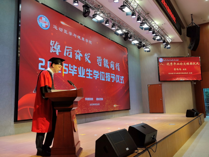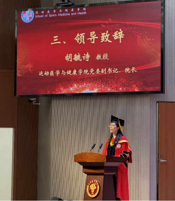 仪式在庄严的国歌声中拉开帷幕。学院党委副书记、院长胡毓诗以“行健不息,积健为雄”校训为核心,激励毕业生勇立潮头,在专业领域深耕细作,推动医学与运动的深度融合创新。教师代表汪敏加结合行业发展趋势,激励学子永葆求知热情。