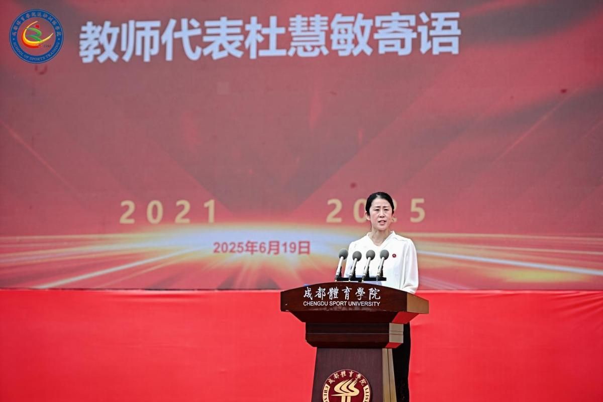 运动训练学院杨成波回顾了学院在竞技体育人才培养和学科建设上的突出成果,充分肯定毕业生们践行“笃训卓竞 业精技专”的专业精神。他寄语学子:“人生没有无法翻越的火焰山!前路纵有坎坷,只要信念不熄、斗志不垮,必能登临绝顶。望你们以‘一勤天下无难事’的狠劲拼搏,在更广阔的人生赛场上续写成体人的奋进诗篇!”