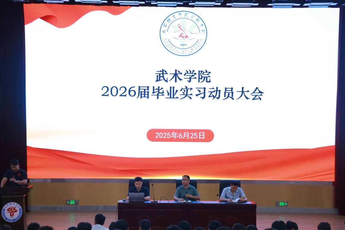 为扎实做好2026届毕业生教育实习工作,引导学生明确实习目标、做好充分准备,武术学院于6月25日下午在行健楼二楼同传室隆重召开2026届毕业生实习动员大会。学院副院长李传国、武术套路教研室主任卿光明、武术搏击教研室主任应磊等教师及全体2026届毕业生参加会议。大会由学管办主任李阳主持。