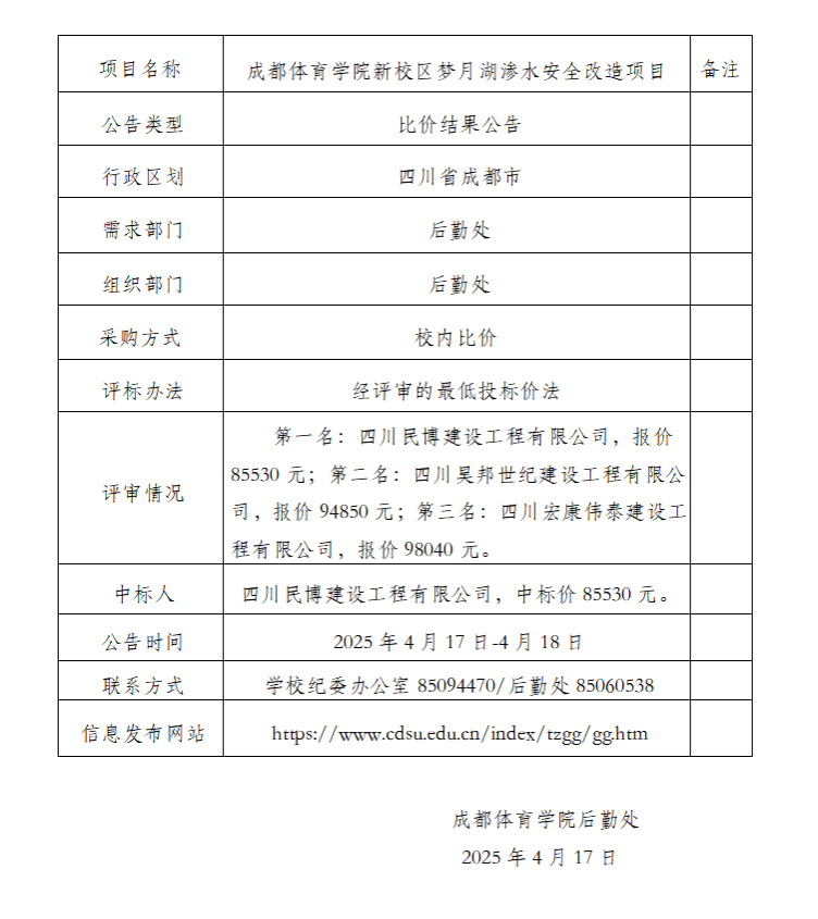sunbet集团中国官网入口新校区梦月湖渗水安全改造项目比价结果公告