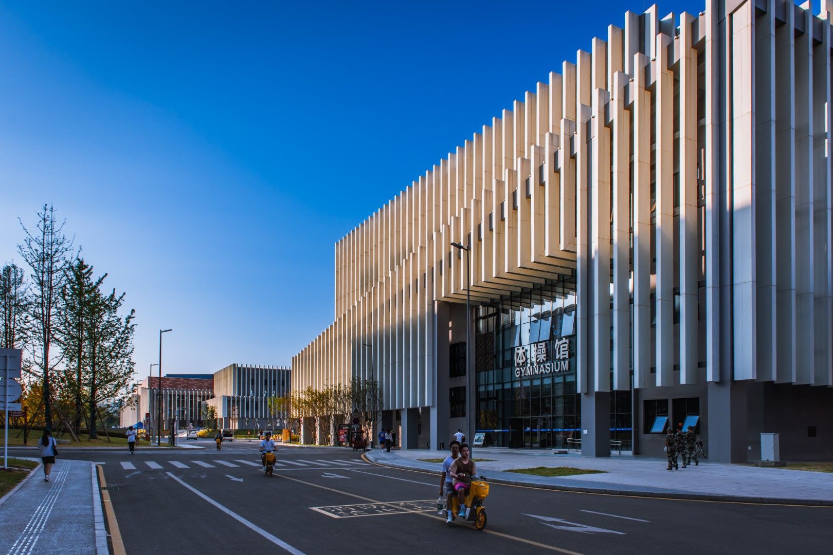 场馆介绍:体操馆建筑面积为10963.50平方米,地上两层,建筑高度26.60米,框架结构。设蹦床1个,双杠场地5片,单杠场地12片,健美操训练场地4片、比赛场地1片。教学训练之余,可作为健身跆拳道、击剑全民健身健美操、舞蹈等或其他室内活动举办场地。