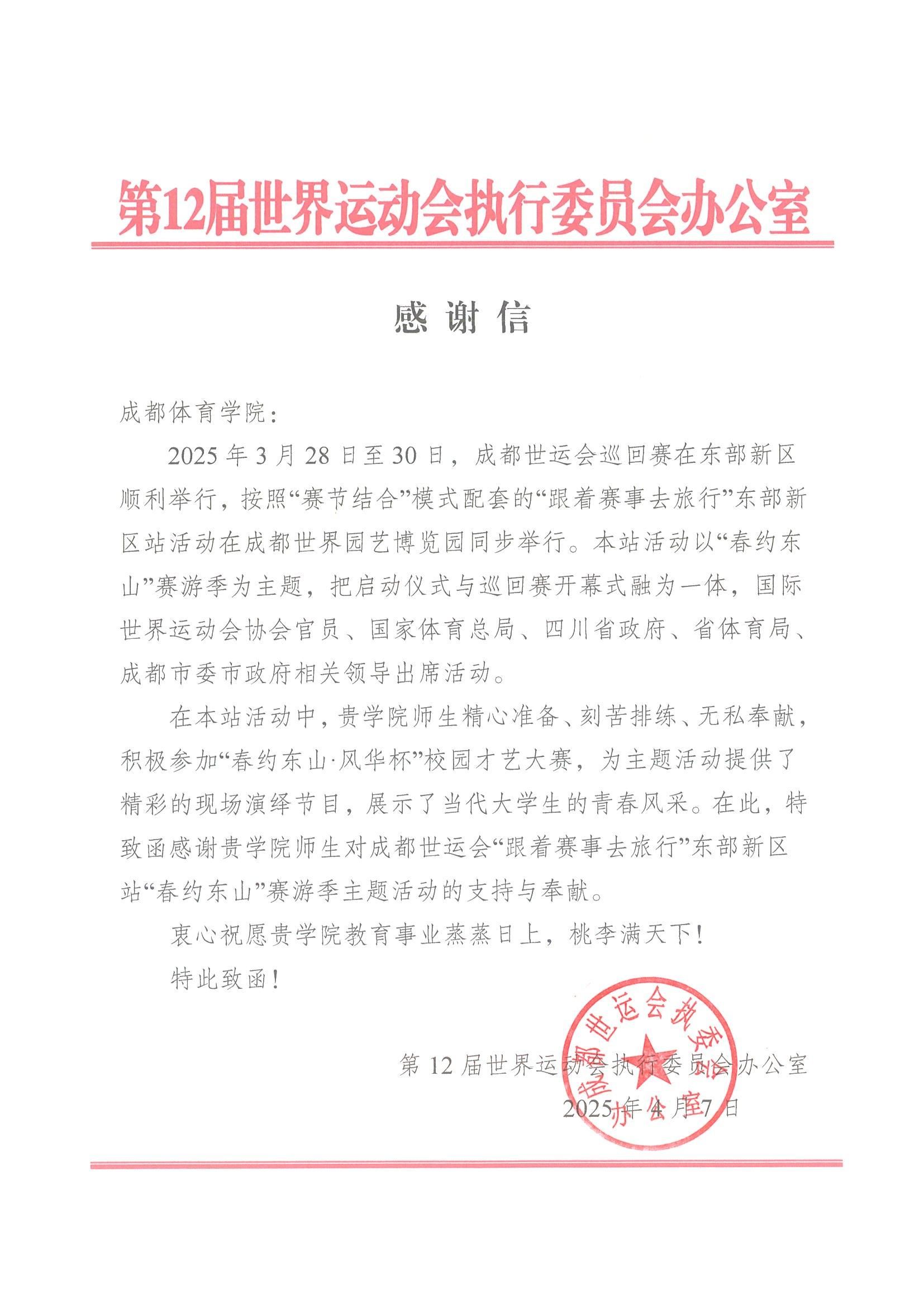 第12届世界运动会执委会向sunbet集团发来感谢信