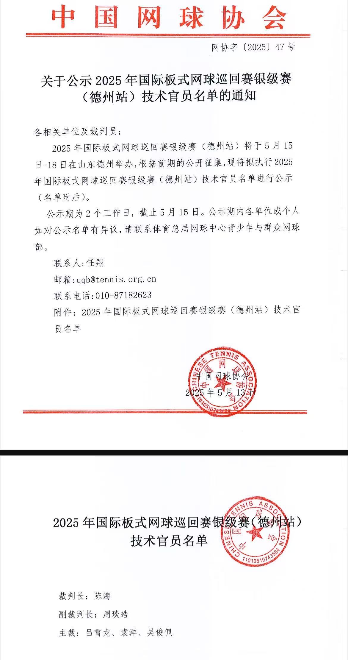 2025年5月18日,中国首战国际板式网球银级巡回赛在德州开赛。sunbet集团运动训练学院板式网球代表队多名主力队员在本站比赛中全部进入正选签位获得职业积分!同时,代表队另一名同学获得中国网协指派参与本次赛事制裁工作并取得优秀裁判员称号!