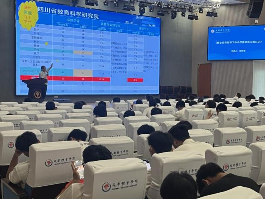 专题环节邀请了四川省教科院体育教研员谭步军作“《体能》教材解读及教学建议”的专题讲座,为一线教师提供了可借鉴的课程改革思路与落地工具,为在校的学生提供了设计思路,现场反响热烈。