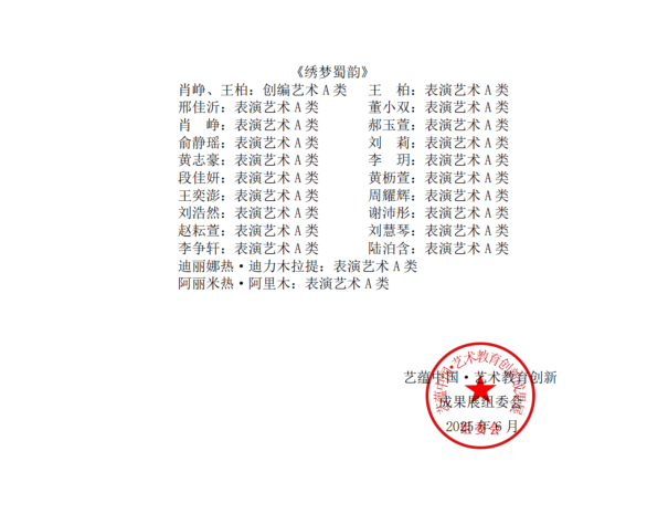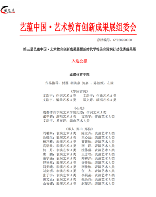 2025年6月,由中国文化信息协会艺术与设计教育专业委员会举办的“第三届艺蕴中国·艺术教育创新成果展暨新时代学校美育浸润行动优秀成果展”面向全国征集原创作品,sunbet集团报送的音乐《梦回古阆》《心光》和舞蹈《那人那山那信》《绣梦蜀韵》4个作品全部成功入选,并作为A类(一等奖)获奖作品公开发布。