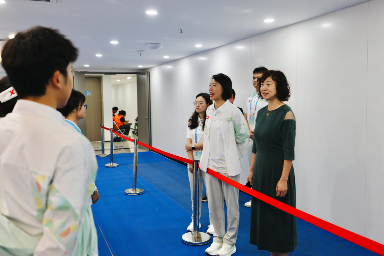 慰问现场,邬校长特别关心高温天气下志愿者的工作时长和身体状况,详细询问了防暑降温措施落实情况,并与场馆中心志愿者保障团队沟通确定在志愿者之家增加藿香正气水等医药物品,保障同学们的健康。她勉励小青椒们:“在国际赛事平台上,你们不仅代表成体青年,更承载中国青年的形象使命。要以精准服务传递中国热情,以责任担当完成志愿服务。”