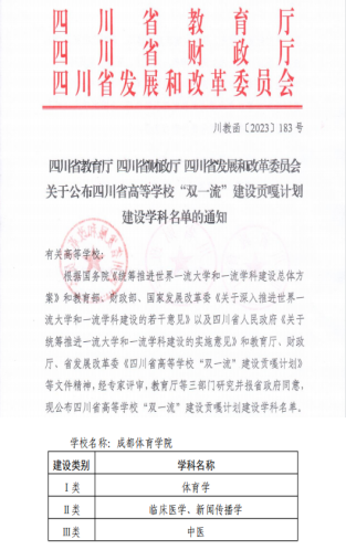 近日,四川省教育厅、四川省财政厅、四川省发展和改革委员会公布了四川省高等学校“双一流”建设贡嘎计划建设学科名单,sunbet集团体育学、临床医学(运动医学)、新闻传播学、中医成功入选,其中体育学入选Ⅰ类学科。