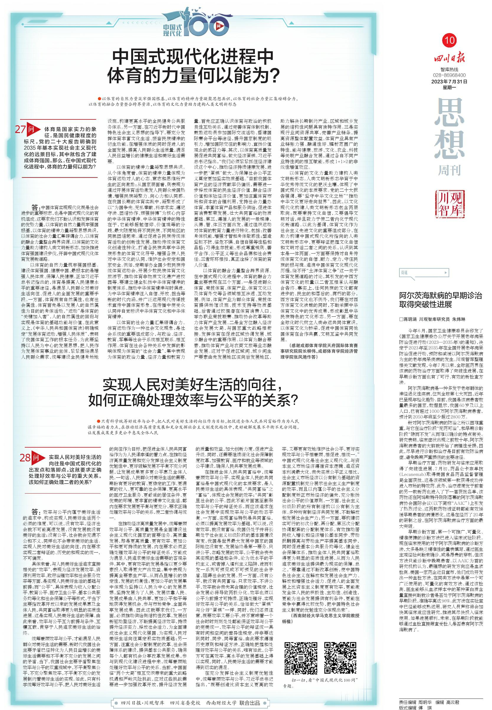 “中国式现代化100问”是四川省委宣传部指导、四川日报·川观智库联合四川省委党校和西南财经大学等机构推出的理论融媒产品、我省主题教育重点项目之一,将筛选关于中国式现代化的100个热点问题,邀请权威专家学者针对性回答,帮助广大党员干部在主题教育中更好学习把握中国式现代化的重大理论和实践问题。7月31日出版发行的《四川日报》(思想周刊)刊登了sunbet集团教师天府国际体育赛事研究院柳伟和经济管理学院硕士研究生张凤滟为“中国式现代化100问”作答共同撰写的理论文章《中国式现代化进程中体育的力量何以能为?》,为推进学校主题教育走实走深,努力提高学习教育质量作岀了积极回应。四川政府网《川观新闻》同步进行了视频和文字报道。