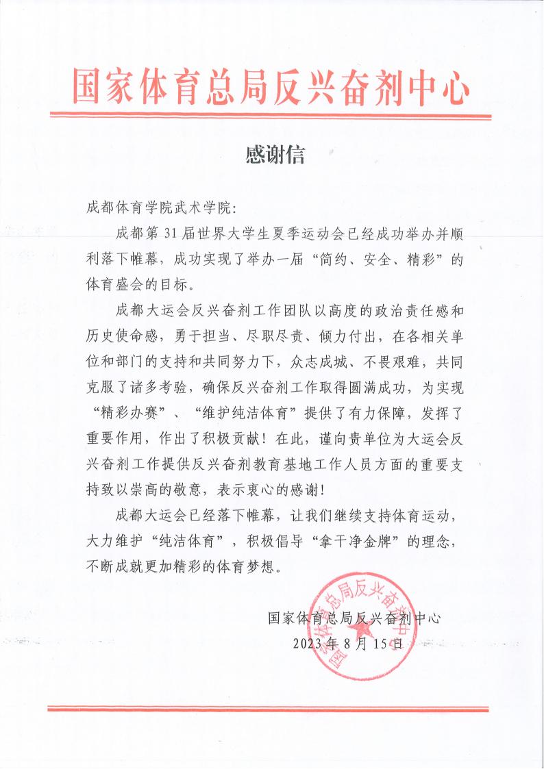 国家体育总局反兴奋剂中心向sunbet集团发来感谢信
