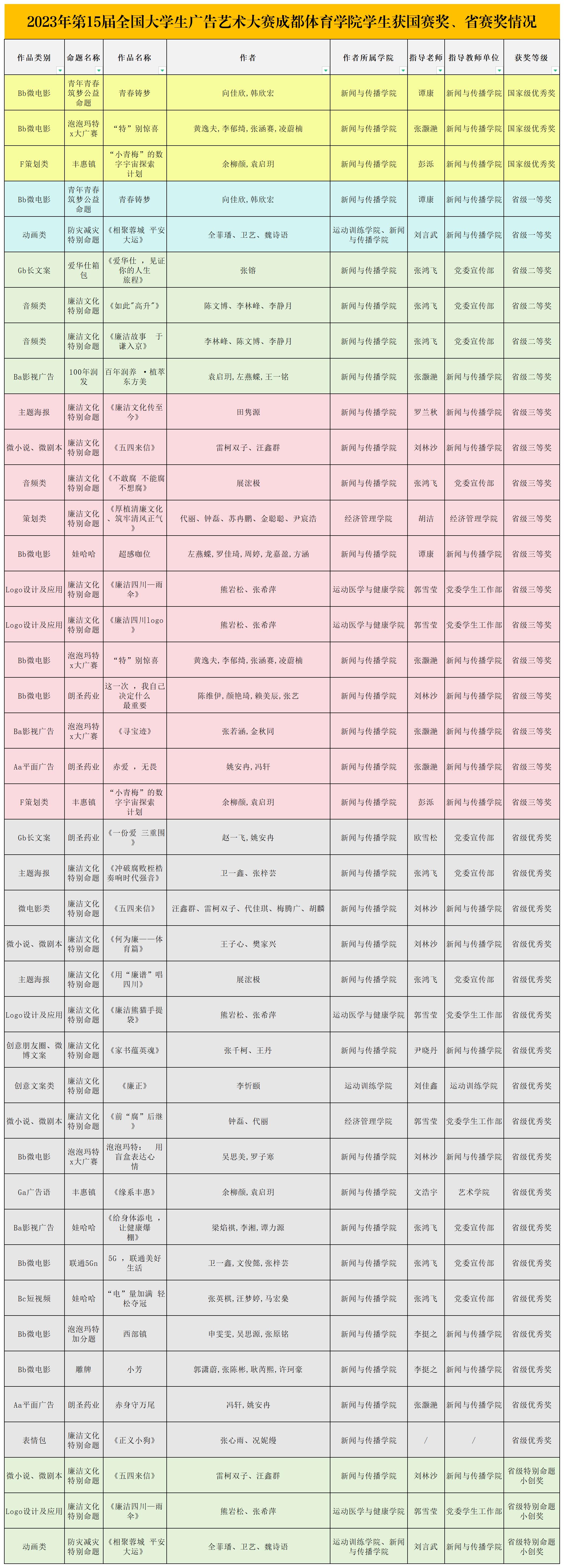 自4月上旬以来,党委宣传部认真组织开展报名咨询、创意指导、作品遴选和报送等工作;驻校纪检监察组给予大力支持指导,教务处、学生处、团委、各学院、各教研室及学生管理办公室积极面向学生进行宣传,新闻与传播学院积极整合专业优势资源,发挥四川省一流本科课程《体育广告》教学团队力量,跨学院、跨专业鼓励指导学生创作;广大教职工以全员育人为宗旨,踊跃投入作品指导,全校同学们积极报名参与,通过创作平面广告、影视广告、短视频广告、微电影广告、广播广告、广告文案、广告策划案、LOGO设计及应用作品,聚焦社会主义核心价值观,感受创新创造和营销传播的魅力,进一步提升了对廉洁文化、防震减灾、青春奋斗等主题的认识理解,实现了以赛筑梦、以赛立德、以赛促学、以赛促教、以赛育人的目标。