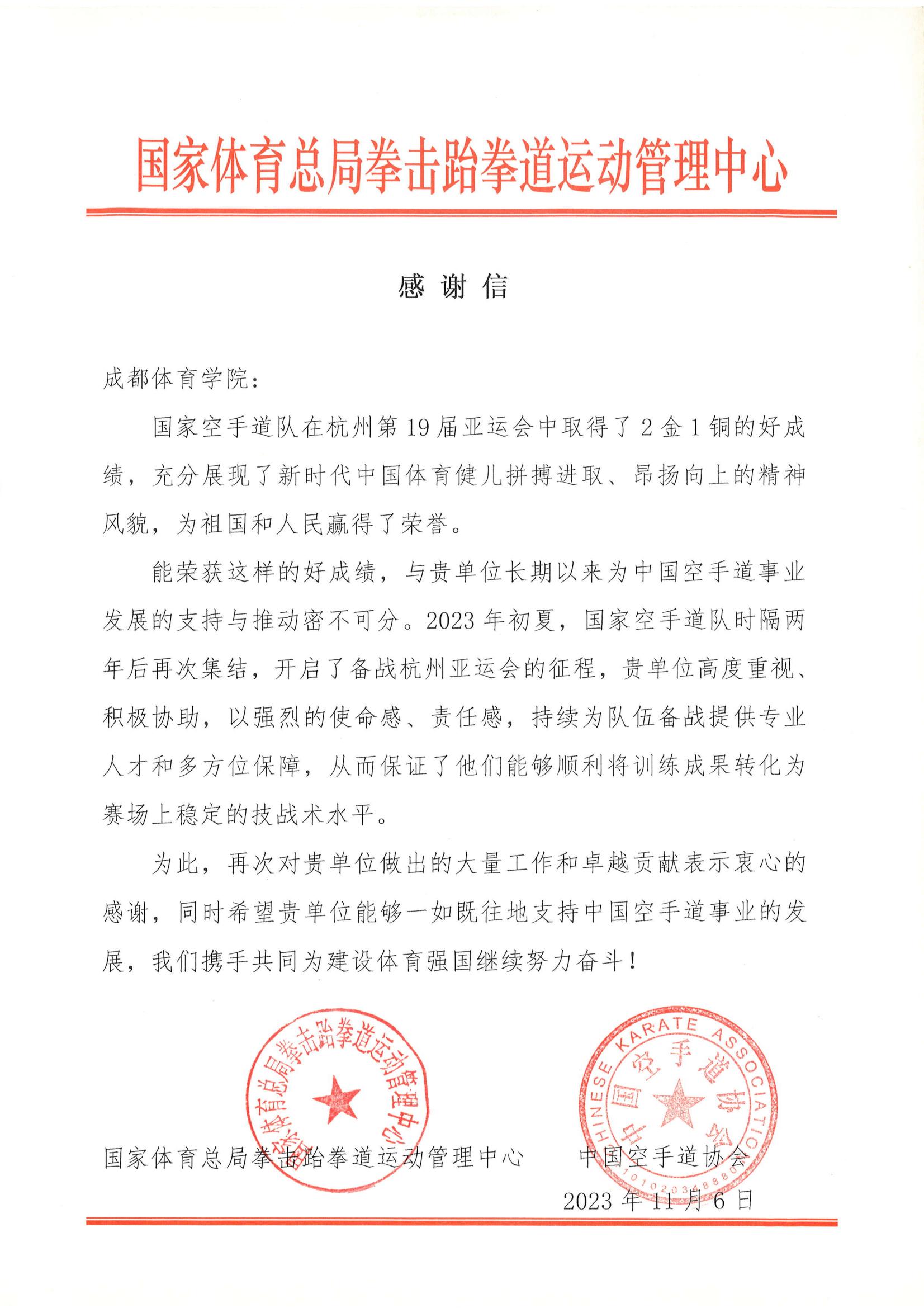 国家体育总局拳击跆拳道运动管理中心向sunbet集团发来感谢信