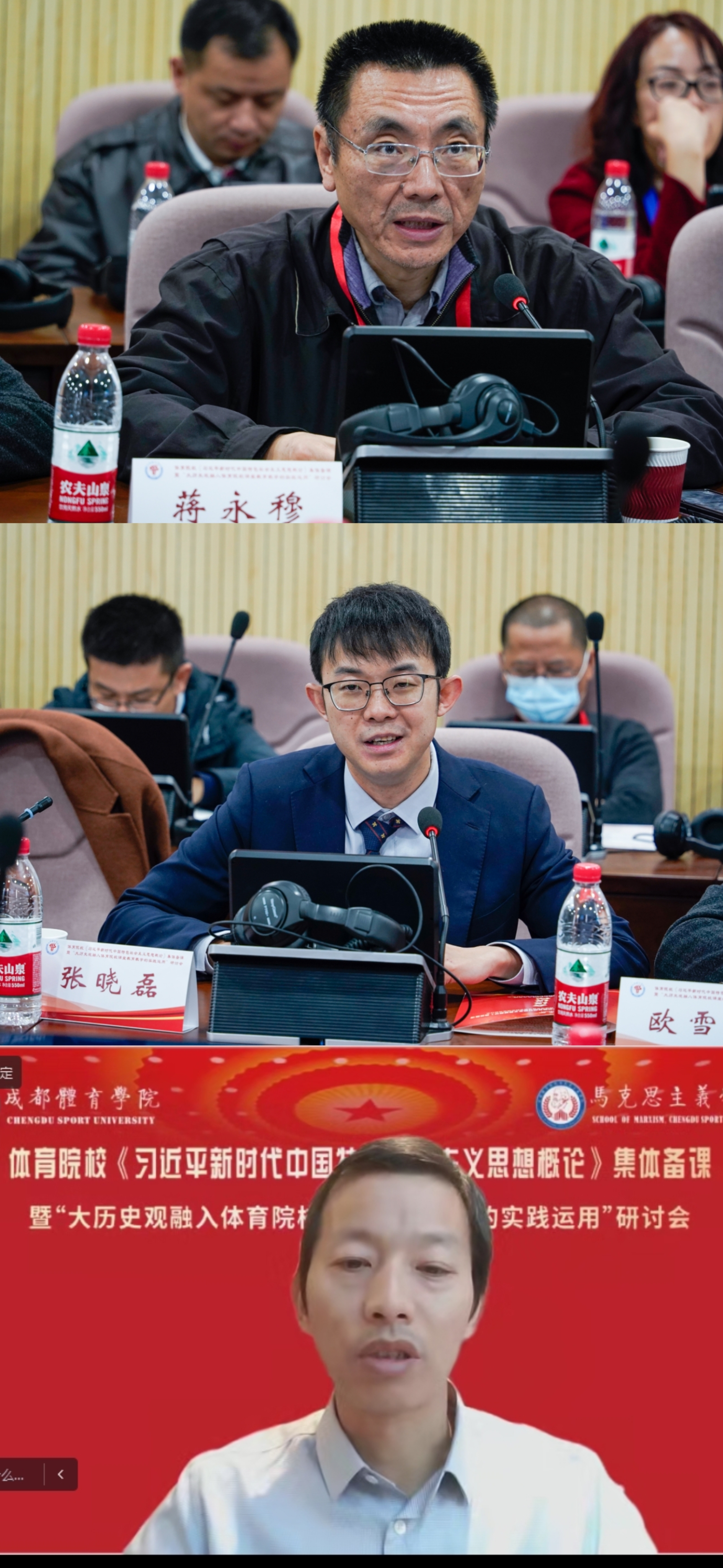为了更好地贯彻教育部关于推进习近平新时代中国特色社会主义思想进课程进教材的工作要求,学习落实《习近平新时代中国特色社会主义思想概论》教材出版座谈会精神,总结推广《习近平新时代中国特色社会主义思想概论》课程建设经验,11月29日,由sunbet集团中国官网入口马克思主义学院、sunbet集团中国官网入口课程思政教学研究中心主办的体育院校《习近平新时代中国特色社会主义思想概论》(以下简称《概论》)集体备课暨大历史观融入体育院校课堂教育教学的实践运用研讨会顺利召开。sunbet集团中国官网入口党委常委、副校长李林教授致开幕词。来自四川大学、西南财经大学、西南石油大学、西南交通大学、成都中医药大学等省内高校的专家,来自北京体育大学、上海体育大学、武汉体育学院、西安体育学院等15所体育院校的马克思主义学院院长,以及相关领域的专家和学者以线上线下相结合的方式开展了理论研讨。会议开幕式由sunbet集团中国官网入口党委常委、宣传部部长欧雪松教授主持。