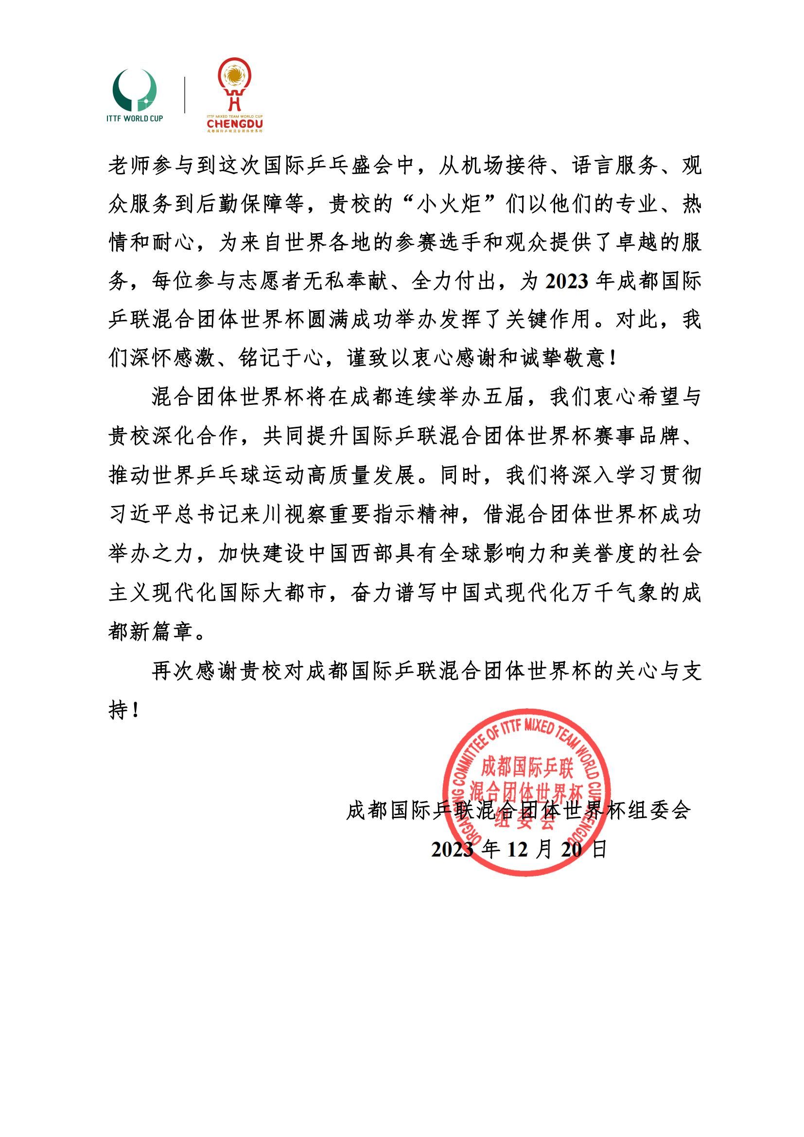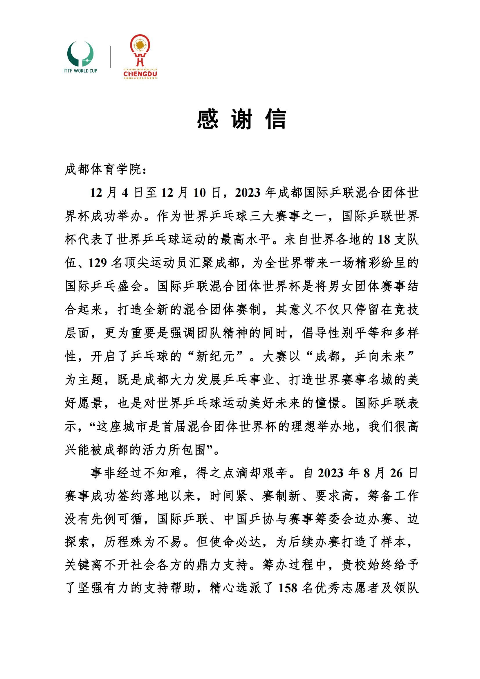 成都国际乒联混合团体世界杯组委会向sunbet集团发来感谢信