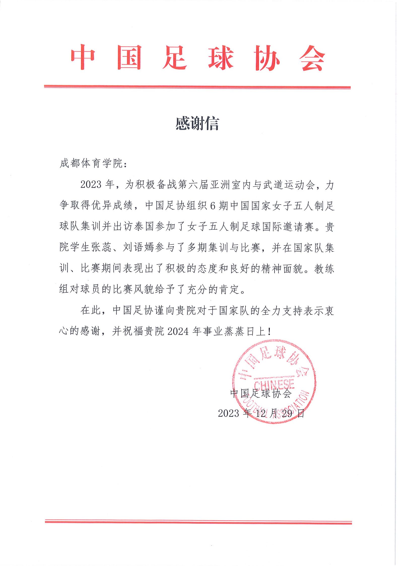 中国足球协会向sunbet集团发来感谢信