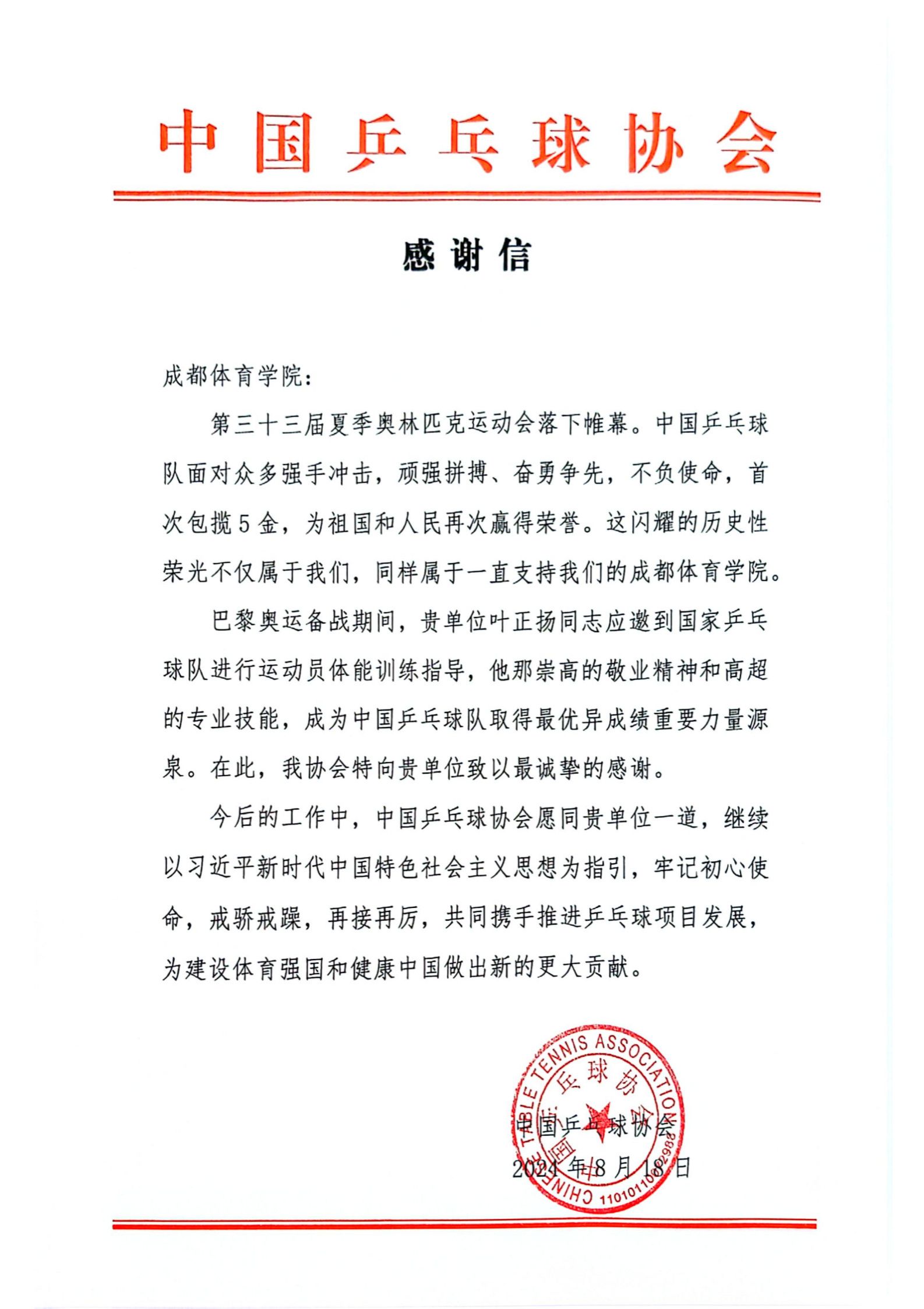 中国乒乓球协会向sunbet集团发来感谢信