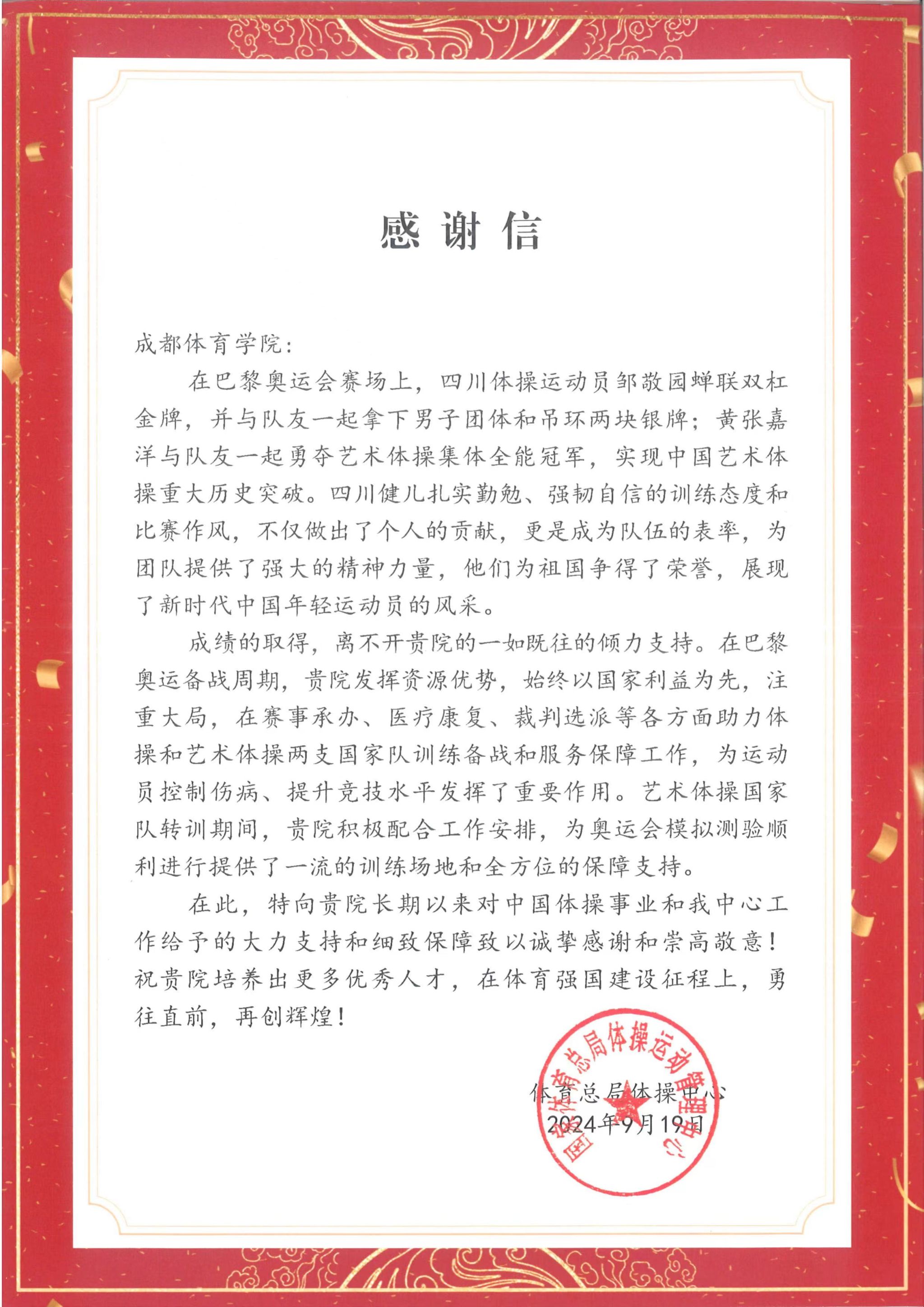 国家体育总局体操运动管理中心向sunbet集团发来感谢信
