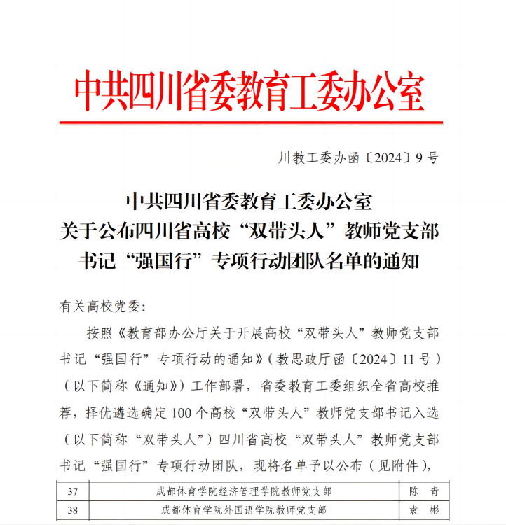 近日,省委教育工委公布了《四川省高校“双带头人”教师党支部书记“强国行”专项行动团队名单》,sunbet集团经济管理学院教师党支部和外国语学院教师党支部选入选四川省高校“双带头人”教师党支部书记“强国行”专项行动团队。