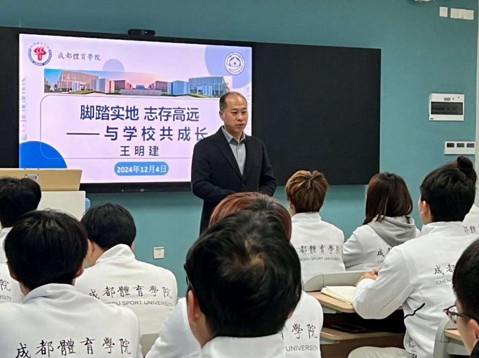 12月4日,学校党委常委、副校长王明建在行健楼A209教室为足球运动学院2023级同学以《脚踏实地,志存高远——与学校共成长》为题,讲授了一堂精彩的“思政课”。
