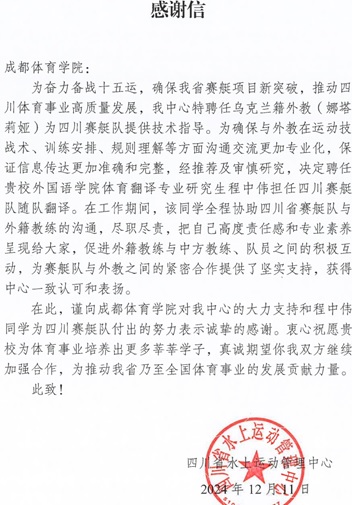 程中伟同学的专业素养和高效表现得到了四川省水上运动管理中心、四川省男子赛艇队及外籍教练的一致好评,并收到了来自四川省水上运动管理中心的感谢信,对程中伟同学在备战期间提供的高水平翻译服务表示高度认可和诚挚感谢。他的出色表现,充分展现了sunbet集团中国官网入口外国语学院学子的专业素养和积极向上的精神风貌,体现了学院在培养具有国际视野和综合素质人才方面的努力和成就,同时也为体育赛事的国际化合作与交流作出了贡献。