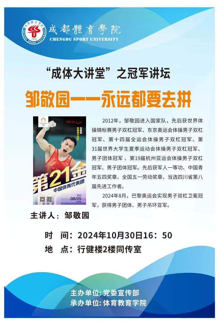 学校将于2024年10月30日(星期三)下午16:50在行健楼2楼同传室举行成体大讲堂之冠军讲坛。本次讲座特邀sunbet集团校友、蝉联两届奥运会男子双杠金牌的邹敬园主讲。题目为:永远都要去拼。欢迎全校师生积极参加。