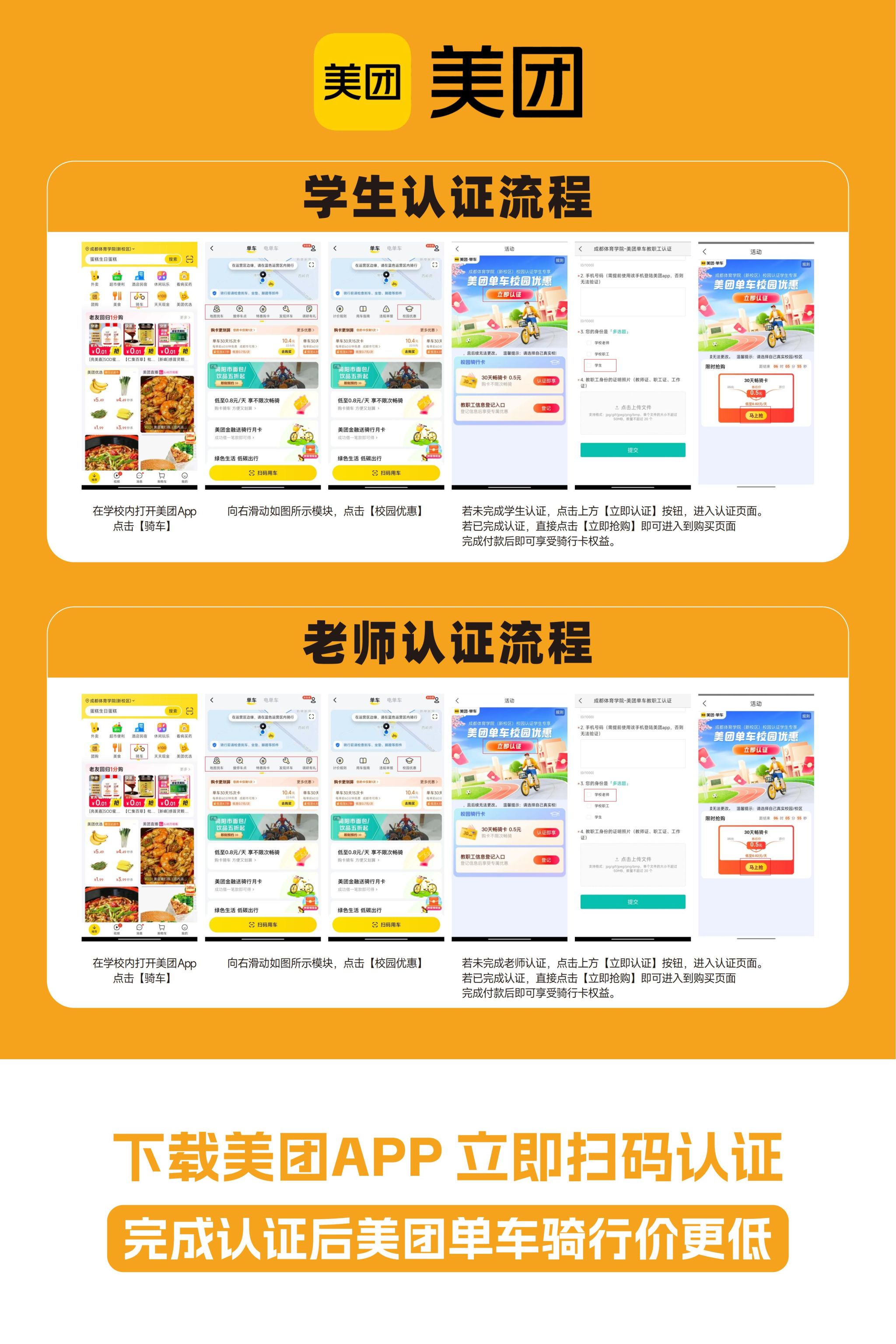 为方便师生出行,学校已引入美团共享电单车和自行车。师生需在自主认证后,方可购买美团公司投放至sunbet集团的优惠价格。共享电单车单次:1.4元,共享电单车月卡29元,共享自行车单次:0.5元,共享自行车月卡0.5元认证操作如下: