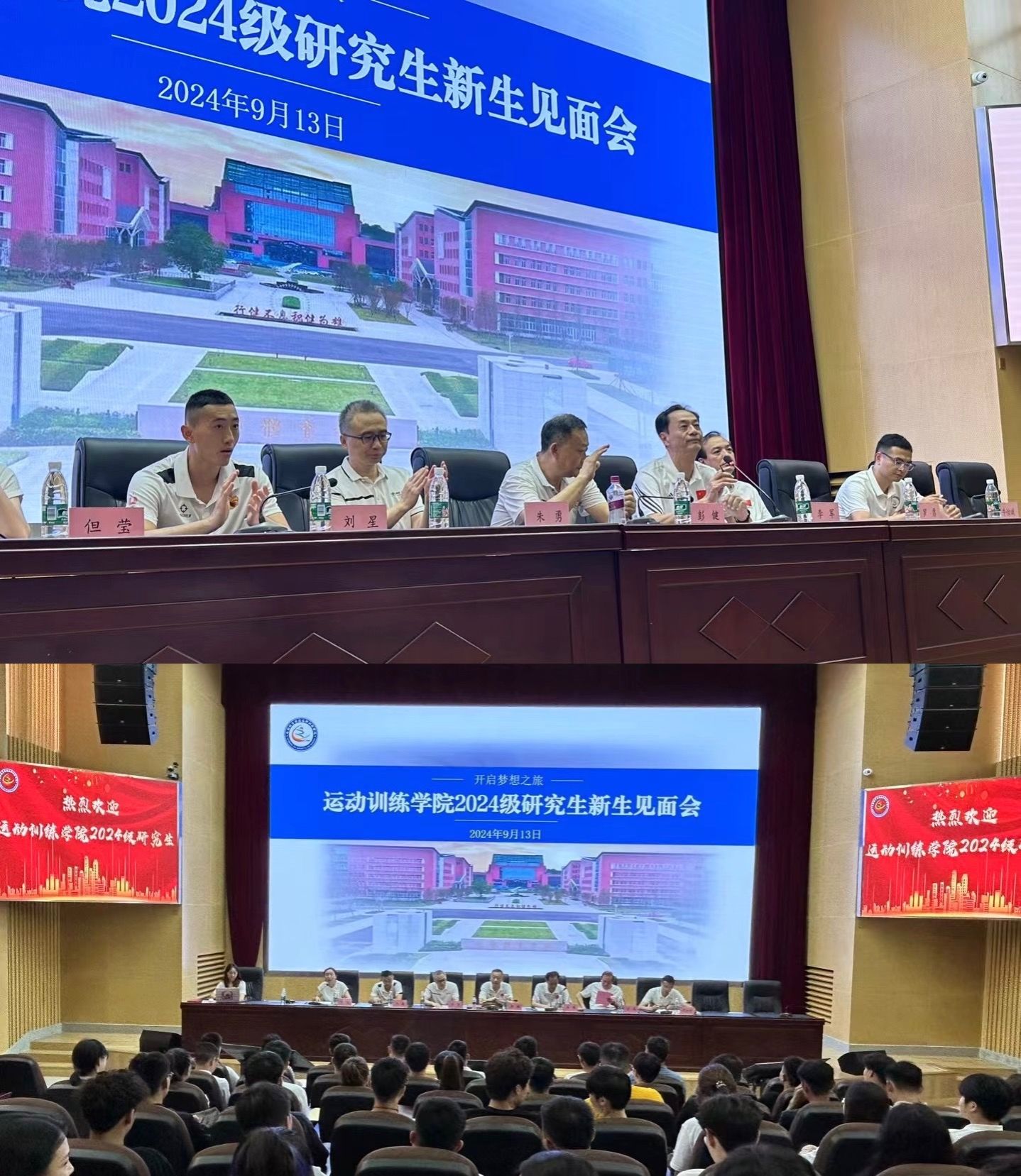9月13日中午,运动训练学院在行健楼同传室举行2024级研究新生见面会。运动训练学院党委书记彭健、院长李军、党委副书记朱勇、副院长罗勇,研究生管理办公室老师、研究生第三党支部临时支部书记,以及运动训练学院2024级全体研究生参会。会议由研究生管理办公室副主任但莹主持。
