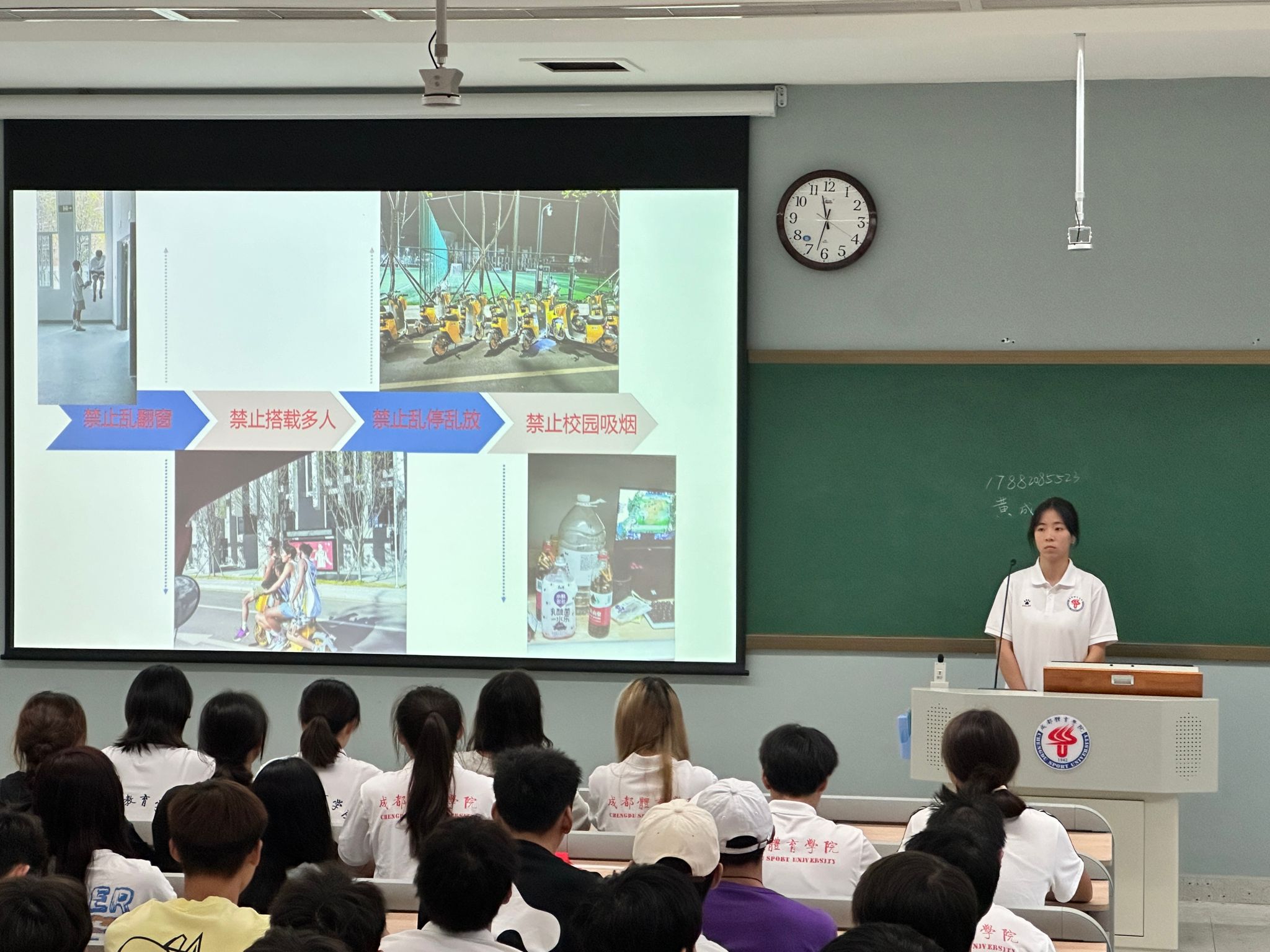 最后,对即将临近的国庆假期,老师们重点围绕消防安全、人身安全、宿舍安全、财产安全、出行安全和网络安全等问题进行强化教育,希望大家切实提高安全意识和自我保护意识,自觉遵纪守法,做到安全返校、按时返校。