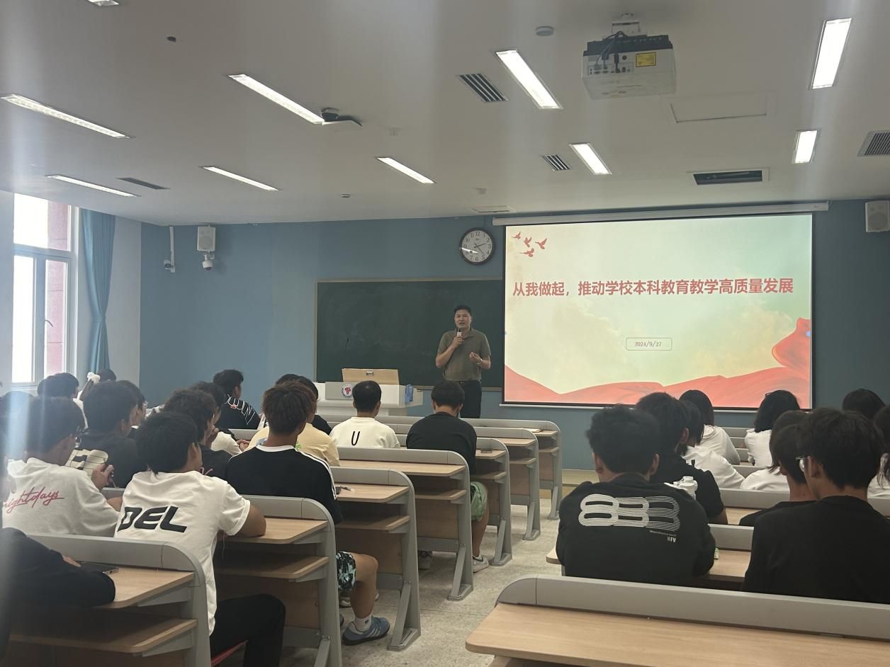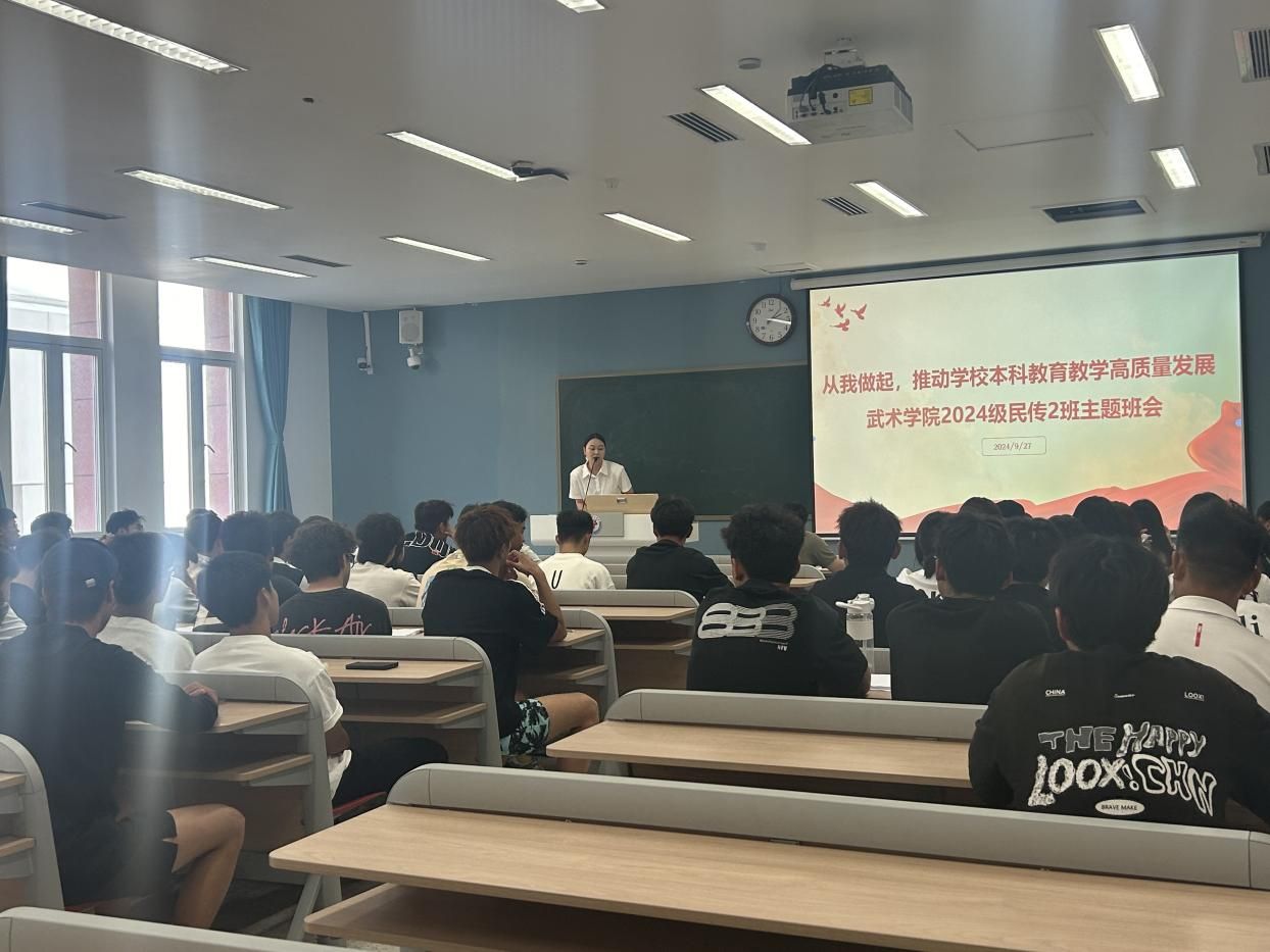 为持续加强新生的入学教育,提高班级凝聚力,武术学院2024级新生班级分别于9月27日和10月10日,开展了以“从我做起,推动学校本科教育教学高质量发展”为主题的教育班会,班会聚焦于本科教育教学审核评估与班级学风建设。武术学院党委书记罗兴山,学生管理办公室主任李阳全程参加活动。
