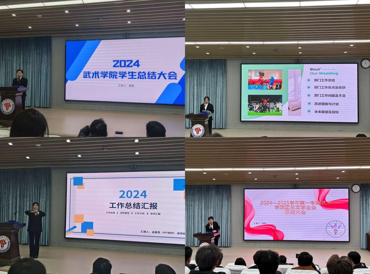 12月26日,武术学院团总支学生会在学校行健楼A100隆重召开了2024-2025学年第一学期总结大会,学院党委书记罗兴山、学生管理办公室老师及团总支学生会全体成员参加。本次大会旨在共同回顾过去一学期的工作,总结经验,查找不足,展望未来,并安排和部署下学期的相关工作。活动由刘洪源老师主持。
