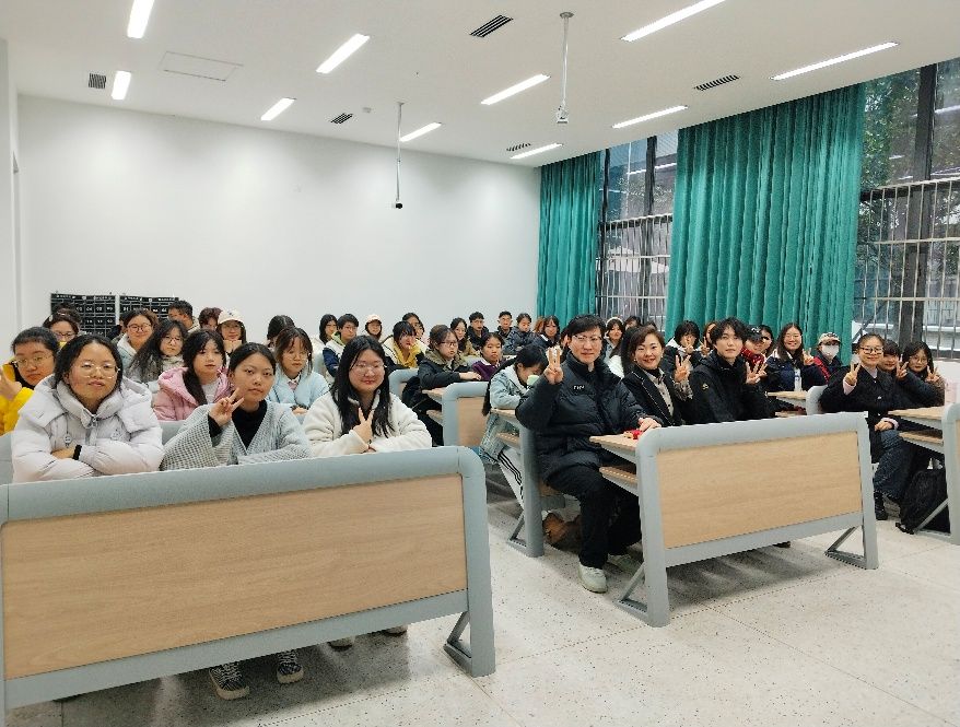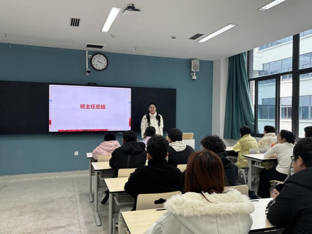 宋秀平在2023级1班班会上进行总结。她结合假期热点新闻,勉励同学们在新的一年要自信自强,认真学习,积极参与实践活动,提高自身专业掌握能力与社会竞争力。